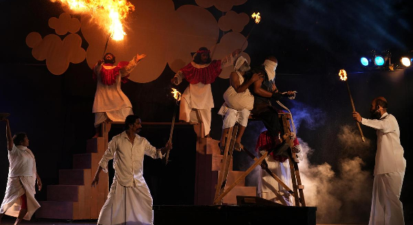 This production serves as a flagship for Ali's Sportive Theatre philosophy, which treats the stage as an ankathattu—the traditional wooden arena used for Kalari duels. By demanding the physical rigor of athletes from his performers, Ali creates a unique kinesthetic energy. Yet, this athletic framing functions largely as a good practice or a magnificent embellishment. The play's intellectual and emotional weight is so profound that even if the sportive element were used sparingly or removed entirely, the dramatic power would not suffer. The Sportive Theatre enhances the rhythm, but the soul of the play resides in its thematic depth.