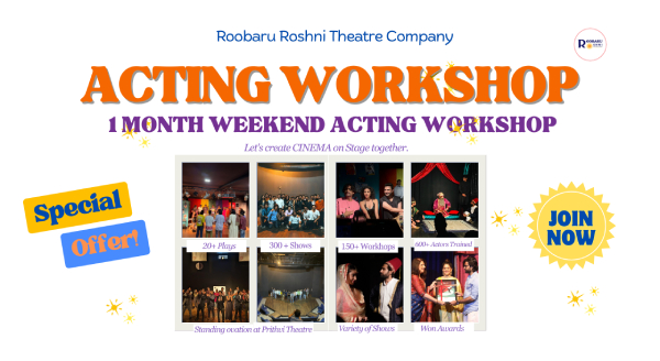 If you have ever felt the urge to perform, express emotions freely, or understand the craft of acting, this **1 Month Weekend Acting Workshop** is designed to help you explore the actor within you. Conducted over four weekends, the workshop focuses on practical training, creative exploration, and performance.