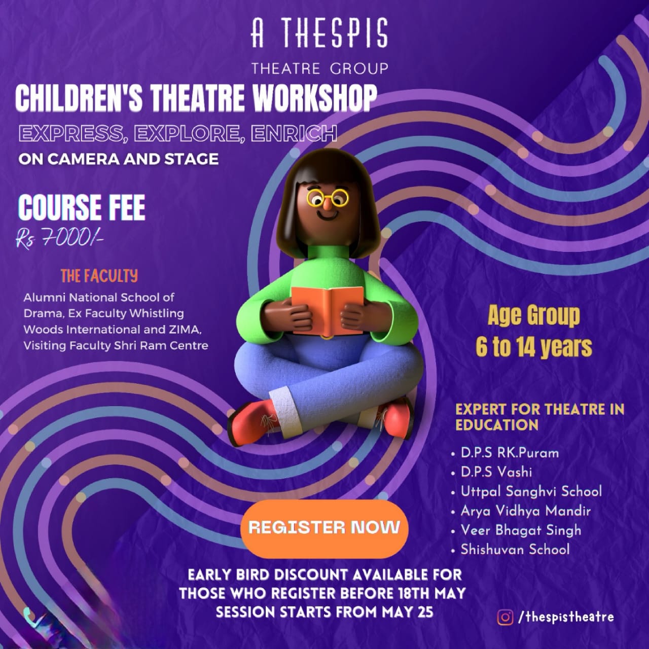 Are your kids interested in exploring the world of acting? Thespis theatre group presents E3 EXPRESS - Explore, Enrich, Empower, a Children acting workshop for ages 6 to 14 years.